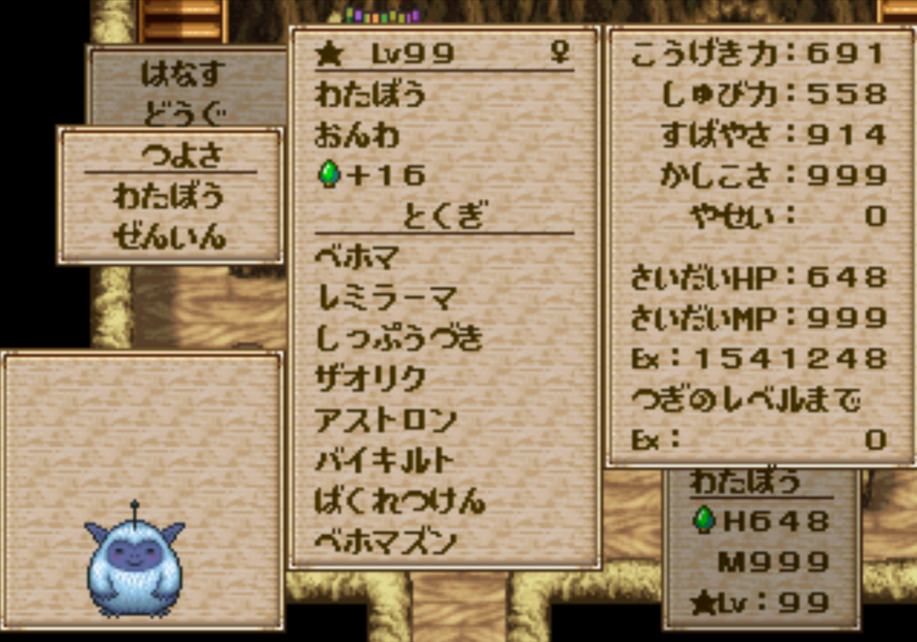 2026-02-20 アストロン+霜降り肉4個 レトロゲーム 2026.02.20 引率役のわたぼうが完成。回復補助攻撃を兼ねておりレミラーマで探索、アストロンで捕獲をサポートしてくれます。 アストロン+しもふりにく4個を試してみたらガンガン他国のモンスターを強奪できました。これまで長い時間をかけて作ったメタルキングも1発で入手可能になりました。利便性が上がった反面、ここから先は作業になりそうな予感がします。