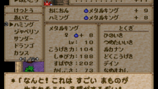 引率役のわたぼうが完成。回復補助攻撃を兼ねておりレミラーマで探索、アストロンで捕獲をサポートしてくれます。アストロン+しもふりにく4個を試してみたらガンガン他国のモンスターを強奪できました。これまで長い時間をかけて作ったメタルキングも1発で...